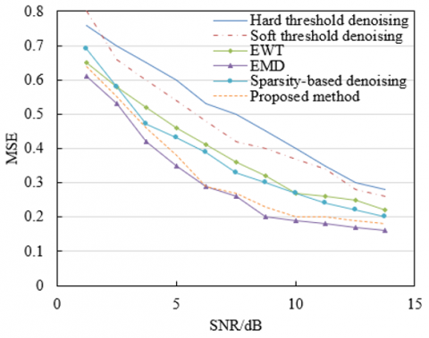 As observed in Figure 6, a decreasing trend in mean squared error (MSE) is exhibited by the proposed method with increasing input signal-to-noise ratio (SNR). When the SNR is 0 dB, the MSE achieved by the proposed method is approximately 0.65, which is notably lower than the values obtained by hard threshold denoising, soft threshold denoising, and EWT. As the SNR increases to 15 dB, the MSE of the proposed method is further reduced to approximately 0.2, significantly outperforming the comparison algorithms under the same noise conditions. For example, the MSE for hard threshold denoising remains around 0.3, while that of EMD is approximately 0.18 but exhibits considerable fluctuation. These results demonstrate that across a range of SNR conditions, the MSE of the proposed method consistently decreases with rising SNR and remains lower than those of the baseline algorithms at all evaluated points. This performance advantage is attributed to the optimized wavelet thresholding strategy, which enables more accurate noise identification and suppression while preserving the informative components of the signal. By contrast, other algorithms present distinct limitations: hard and soft threshold denoising methods exhibit insufficient flexibility in noise suppression, often resulting in either loss of signal features or retention of residual noise. Additionally, methods such as EWT and EMD display limited adaptability when processing signals with varying SNRs, leading to less pronounced MSE reduction or unstable error performance. Therefore, the proposed method demonstrates superior robustness and adaptability across a wide range of noise conditions. Its trend of decreasing MSE with increasing SNR is more significant.