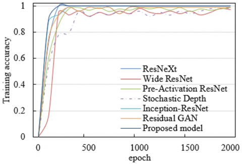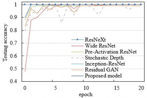 As observed in Figure 7, the training and testing accuracy curves of the proposed model demonstrate exceptionally fast convergence. The training accuracy stabilizes and reaches 100% after only 280 iterations. In terms of testing accuracy, a value of 99.5% is attained after the very first epoch, with further increases leading to stable convergence at 100% in subsequent epochs. By comparison, the six benchmark models—including Aggregated Residual Transformations for Deep Neural Networks (ResNeXt) and Wide ResNet—exhibit noticeable fluctuations during both training and testing phases. For instance, the training accuracy curve of the Stochastic Depth model shows repeated oscillations, and the testing accuracy of Wide ResNet displays multiple declines across epochs. These variations indicate that the training processes of the baseline models are less stable. The experimental results confirm that the proposed model achieves high testing accuracy at an early stage—99.5% in the first epoch—and rapidly stabilizes at 100%. The instability observed in the benchmark models is largely attributed to the absence of targeted signal preprocessing techniques and suboptimal network architecture design, resulting in reduced performance when handling noisy inputs or learning complex feature relationships. This comparison provides strong evidence of the proposed model’s significant advantages in terms of convergence speed and accuracy stability. Specifically, the proposed method converges faster and reaches 100% training and testing accuracy earlier and more consistently than the other six models evaluated.