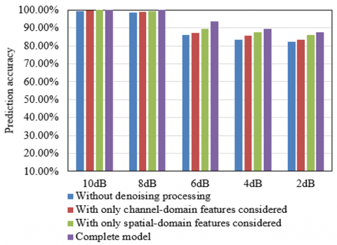 As shown in Figure 8, the complete model consistently outperforms the other three configurations under various SNR conditions. At an SNR of 10 dB, the prediction accuracies for the models without denoising, with only channel-domain features, and with only spatial-domain features are approximately 95%, 98%, and 98%, respectively, whereas the complete model achieves 100%. As the SNR decreases to 2 dB, the prediction accuracy of the model without denoising drops to approximately 80%, while the models with only channel-domain and spatial-domain features achieve approximately 85% and 88%, respectively. In contrast, the complete model maintains a higher accuracy of approximately 90%, demonstrating superior stability and robustness across different noise levels. The results of the ablation study validate the critical importance of both the improved wavelet threshold denoising process and multi-domain feature fusion—specifically the integration of channel-domain and spatial-domain features—in enhancing prediction accuracy. When denoising is omitted, the presence of high-frequency noise significantly degrades performance, confirming the effectiveness of the proposed denoising strategy in preserving useful signal characteristics. When only a single domain of features is considered, the model’s representation of signal characteristics is incomplete, resulting in lower prediction accuracy compared to the full model. The complete model, by incorporating the improved wavelet thresholding method, effectively suppresses noise and provides more accurate data for subsequent prediction tasks. Furthermore, the use of a ResNet for multi-domain feature integration enables more comprehensive learning of complex nonlinear relationships. As a result, higher and more stable prediction accuracy is achieved across varying SNR conditions, highlighting the synergistic advantage of combining denoising and multi-domain feature fusion in the proposed method.