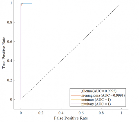 GoogLeNet, VGG19, and ResNet50 each demonstrate strong individual performance. Among these models, ResNet50 achieves maximum scores across all metrics, including accuracy (98.25%), precision (98.25%), specificity (99.42%), sensitivity (98.25%), and F1-score (98.25%). The inclusion of skip connections in ResNet50 effectively addresses the vanishing gradient problem, allowing for the training of deeper networks. This capability enables the model to capture both fine details and global structures in MRI images, leading to superior classification performance across various tumor types. Notably, all individual models exhibit very high specificity, indicating their robust ability to accurately identify negative cases, with ResNet50 leading at 99.42%. Combining these models with a subset of 3000 features significantly improves overall performance. The combined model achieves uniformly higher scores across all metrics compared to the individual models, with accuracy, precision, sensitivity, and F1-score all at 98.77%, along with a particularly high specificity of 99.60%.