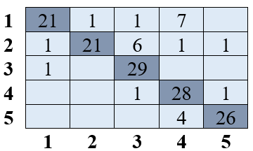 All experiments conducted in the study were carried out under equal conditions. Table 1 includes hyperparameter information of deep models. In addition, the experiments were conducted on a laptop with an i7 processor, 32 GB RAM, and 6 GB graphics card. When using machine learning classifiers, a cross-validation ratio of 5 was chosen. The following measures were used to compare the methods’ performances: F-score (F1), Accuracy (Acc), Specific (Spc), Precision (Pre), Sensitivity (Sens), False Discovery Rate (FDR), False Negative Rate (FNR), and False Positive Rate (FPR) [29]. Ak, Ala İdris, Buz Gülü, Dimnit, and Nazlı classes in the confusion matrix are represented as 1, 2, 3, 4, and 5 respectively.