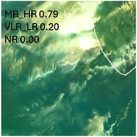 After training and validation, the trained model is tested with satellite images of each category. The model generates probability estimates for different rainfall categories of the test image and subsequently predicts the specific rainfall category for the tested image. Figure 6 shows a predicted test image. It is a satellite image belonging to MR_HR and the probabilities predicted are: NR- 0, VLR_LR- 0.21 and MR_HR-0.79. Since the highest probability value is that of MR_HR, the predicted rainfall category is MR_HR.