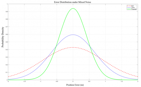 Under hybrid noise conditions (impulsive + Gaussian), the proposed method achieves a position estimation error variance of 0.18, corresponding to a 79.3% reduction compared to conventional approaches. As shown in Figure 6, the X-axis error distribution of our method exhibits a 95% confidence interval of ±1.12 m, demonstrating improved performance over baseline methods.