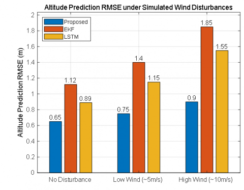 Figure 7 compares the altitude prediction RMSE for the different methods under the three simulated conditions: no disturbance, low wind disturbance, and high wind disturbance.