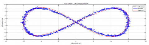 The spatial tracking performance during Figure 8 maneuvers is illustrated, where the black dashed line denotes the reference trajectory, the blue solid line represents the proposed method, and the red dashed line corresponds to the baseline method from [23]. The proposed method achieves a maximum position error of 1.12 m, demonstrating a 52.1% reduction compared to the baseline (2.34 m).