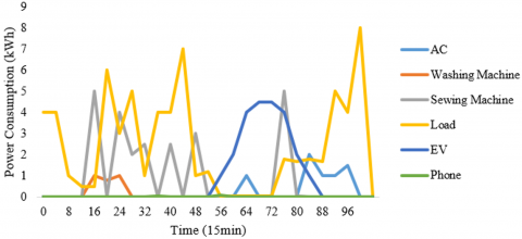 In a nutshell, HEMS is a mathematical optimization problem with complicated changes in the environment, involving a range of devices with unique properties. To maximize the equipment's DR capability and cost-effectiveness, proper management is essential. In Figure 4, four-day consumption of electricity examples are chosen at random. The power utilization time series of an electric automobile, dishwasher, air conditioning, and heaters are displayed in various color curves as the four primary adjustable elements. Overall home energy consumption, total number of programmable and non-controllable loads, is shown by the blue lines. The green color curve represents solar PV generation. The energy consumption of the entire family, solar photovoltaic, cooling systems, and electric automobiles that have a bigger influence on consumers' energy consumption are chosen in this instance as seen in Figure 4. Over the course of a year, one house's worth of data is gathered every 15 minutes for the method's development. The local power operator chooses the energy pricing information, which includes the PV on-grid price and the time-of-use plan. The required simplified changes were done in accordance with the algorithm's requirements. One might consider the power price structure mentioned above to be fixed. The devices should be grouped together since they operate in distinct ways. The electrical devices owned by the occupants may be categorized into three groups based on their physical makeup and consumption patterns: