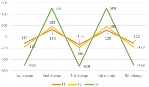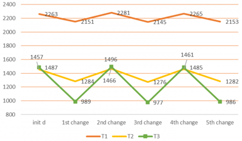 According to the data analysis in Table 2, significant variations exist in the frequency of sleep state changes among different experimental subjects. Overall, no clear pattern is evident in these changes. However, by further examining the state change magnitudes for individual subjects using the data in Table 3, certain regularities can be identified. As illustrated in Figure 15, the change distance for T1 primarily fluctuates around 2200mm as the central axis, T2 exhibits fluctuations centered around 1400mm, and T3 demonstrates a concentration near 1200mm.