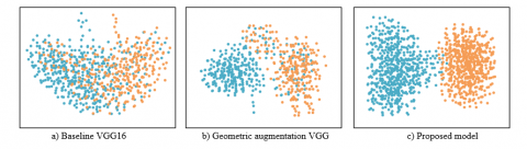Figure 6 presents the t-distributed Stochastic Neighbor Embedding (t-SNE) visualization results of unsupervised remote sensing image feature distributions on the test set. In the feature distribution of the baseline VGG16, the blue and orange points are highly intermixed, indicating low inter-class separability. Although the features of the geometric augmentation VGG exhibit partial separation, significant overlap remains. In contrast, the proposed model demonstrates highly compact clusters of blue and orange points, with minimal overlap, reflecting excellent class separability in the feature space. These results indicate that the proposed model possesses superior feature learning capabilities, effectively distinguishing between different categories. It can be concluded that the proposed model provides clearer and more enriched image features, and that the newly developed unsupervised classification method—combining transfer learning with GANs—further optimizes both the feature extraction and the classification network. The high degree of feature separability achieved by the proposed model in low-dimensional space validates its ability to significantly enhance feature discriminability, leading to improved classification performance.