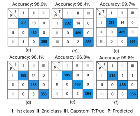 The confusion matrices of the state-of-the-art models with the highest classification accuracy are presented in Figure 2. The lowest accuracy value obtained among the models is 96.8%, indicating that all models perform exceptionally well. In the confusion matrices, the columns and rows are labeled I, II, and III, representing 1st class, 2nd class, and capstem categories, respectively. Misclassifications are represented by cells outside the blue-colored squares. Notably, all models successfully identified capstems without any misclassifications. This demonstrates that the models perfectly distinguish raisins with capstems.