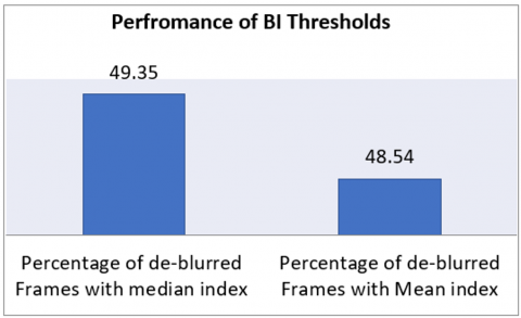 The proposed method calculates the modified blurriness index using Eq. (15), for each frame. The blurriness index of each frame is compared with the threshold (Th) is defined as Th=mean(bi). If blurriness index bi<Th then the corresponding ith frame is identified as the blurry frame. Only the identified frames with significant blur will be De-blurred. The threshold Th is taken as the mean value since it is independent of the speed and direction of motions, and perform equally well in all type of motions.