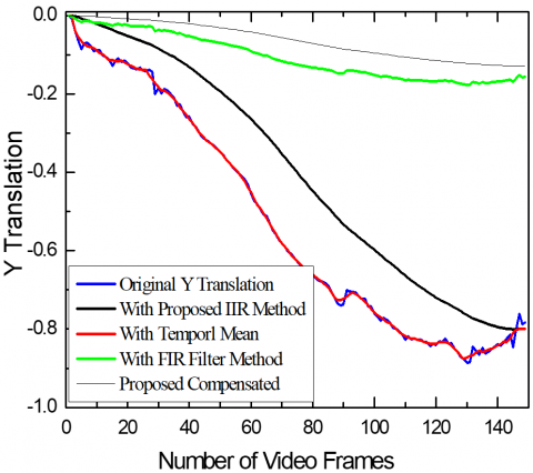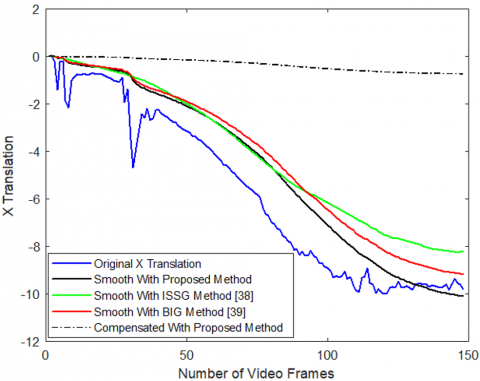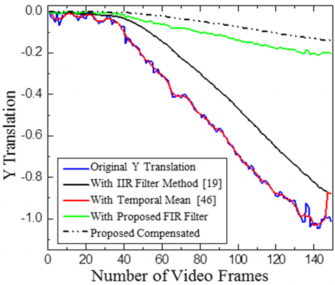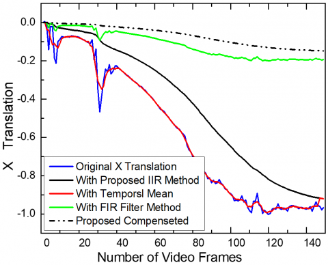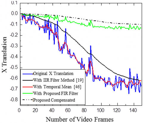The results of smoothened X and Y translations of Highway Videos 2 and 6 are compared for various blurriness indexes and compensated translation after Gaussian Kernel filtering for the proposed method is also shown as in Figure 16. The proposed method gives better smoothened and stabilized translation results.