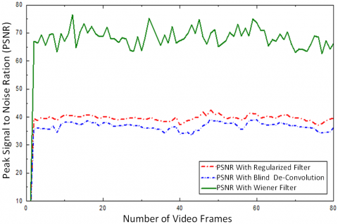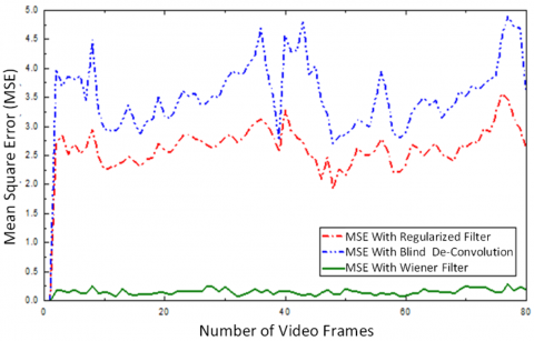 The proposed method offers the best average ITF with blurriness index performance or average ITF of 13.65537 for original videos, and compared with average ITF of studies [7, 8] and proposed respectively as 14.3226, 13.13715, 14.70812 and proposed method offer the best. The improvement in ITF represents the contribution of research. The proposed method compares the performance of three de-blurring methods and it is clear the proposed method of Wiener filter offers the minimum MSE and maximum PSNR.