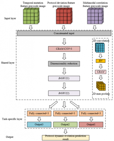 This paper constructs a Convolutional Block Attention Module – Convolutional Neural Network – Double Bidirectional Gated Recurrent Unit – Multi-Task Learning (CBAM-CNN-DBiGRU-MTL) network based on a multi-task learning framework as the protocol dynamic evolution prediction model. Among them, the CBAM-CNN module combines CNN and CBAM to achieve efficient extraction of spatiotemporal features and key information focus in the process of protocol dynamic evolution, meeting the research goal of the "protocol dynamic evolution prediction model" in capturing protocol temporal dependencies and feature importance.