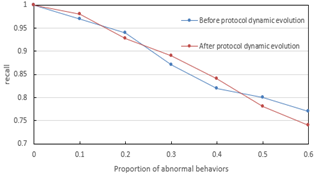 From Figure 7, it can be seen that under different abnormal behavior proportions, the model after protocol dynamic evolution significantly outperforms the model before evolution in accuracy, precision, recall, and F1 score. When the abnormal proportion is 10%, the accuracy after evolution approaches 1, while before evolution it is slightly lower; as the abnormal proportion increases to 60%, the F1 score after evolution still remains above 0.75, far exceeding the 0.7 before evolution. This indicates that the protocol dynamic evolution prediction model proposed in the second part of the paper effectively improves the early warning ability for abnormal behaviors by capturing the dynamic trend of protocol state transitions, enhancing the model's semantic anomaly discrimination capability. Meanwhile, combined with the image mapping in the first part and the multimodal fusion in the third part, the model achieves complementary cross-modal information: visual features capture local temporal mutations, protocol dynamic features identify global semantic deviations, and their synergy allows the model to maintain high robustness under fluctuations in abnormal proportions. Experimental data verify the superiority of the "image processing + protocol dynamic modeling + multimodal fusion" technical route. The model's lead in all performance indicators after protocol dynamic evolution directly reflects the method's precise recognition capability for complex network abnormal behaviors.