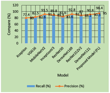 A comparison between different deep learning models regarding specificity and ROC-AUC score findings exist in the Table 4 and Figure 7. The proposed model (FL) achieves the best combination of specificity (96.3%) and ROC-AUC score (98.7%) which demonstrates its great capability to differentiate between negative and positive outcomes with excellent overall performance. The deep learning models DenseNet169 and MobileNetV2 demonstrate strong discrimination capabilities between classes with 93.4% specificity and 95.9% ROC-AUC and 92.3% specificity and 94.5% ROC-AUC respectively. The performance levels of InceptionV3 and DenseNet121 maintain reliability through their 90.1% specificity and 92.0% ROC-AUC scores alongside 91.1% specificity and 93.0% ROC-AUC scores respectively. The performance of Xception (81.0% specificity, 83.3% ROC-AUC) is the least effective among the assessed models while VGG16 (83.8% specificity, 85.6% ROC-AUC) together with ResNet50 (84.0% specificity, 86.3% ROC-AUC) demonstrate moderate success. FL presents strong evidence of being the best model since it demonstrates higher accuracy rates in distinguishing between positive and negative cases than all alternative models in the study.
