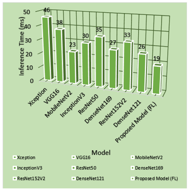 The presented table shows the time needed for deep learning models to make inferences. The proposed model (FL) delivers the shortest inference duration of 19 milliseconds thus making it the most efficient solution. MobileNetV2 runs inference at a speed of 23ms because of its compact design. DenseNet121 takes 26 milliseconds to perform tasks while DenseNet169 requires 27 milliseconds during the process as depicted in Figure 9 and Table 6. The inference times for InceptionV3 (30 ms) and ResNet152V2 (33 ms) along with ResNet50 (35 ms) fall in between while VGG16 (38 ms) and Xception (46 ms) need more time due to their complex computational structure. The proposed model together with MobileNetV2 represents the most effective configuration for real-time applications because they deliver the best inference efficiency.
