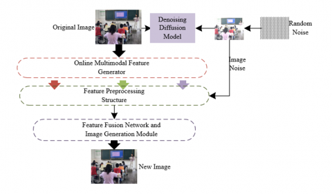 The adaptive enhancement algorithm proposed in this paper is based on the diffusion model and constructs a three-level processing architecture of “feature extraction - cross-modal fusion - scene generation”, specifically adapted to the complex characteristics of remote education multimodal images. Firstly, the modality feature online generation module uses lightweight convolutional networks and attention mechanisms to automatically parse multi-dimensional inputs such as color textures of RGB images, spatial coordinates of depth images, and thermal radiation distributions of infrared images, without manually preset feature extraction rules, significantly reducing the algorithm’s dependence on specific devices or scenarios. While inheriting the prior knowledge of the stable diffusion model, the backbone network weights are frozen to retain its strong image generation capability. At the same time, a customized feature fusion module for remote education scenarios is improved: in the feature preprocessing stage, a text encoder is used to convert the description of the teaching scenario into a semantic feature sequence, which is input into the U-shaped network together with image modality features. The multi-level attention feature fusion units and enhanced gate-controlled self-attention modules designed inside the network can dynamically capture the behavior-associated features between different modalities. For example, aligning the hand motion area in RGB images with the three-dimensional coordinates in depth images enhances the feature expression of key behaviors such as “writing” and “clicking on the screen”. Finally, the high-dimensional fused features are sampled through a variational encoder to generate new images that retain the behavioral attributes of the original scenario and conform to real-world distribution, ensuring that the generated data is deeply consistent with remote education scenarios in terms of semantics and geometric structure.