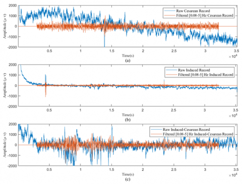 Figure 2. The raw EHG waveforms for the three delivery types, as well as their filtered versions: (a) Early Cesarean (b) Early Induced (c) Early Induced-Cesarean
