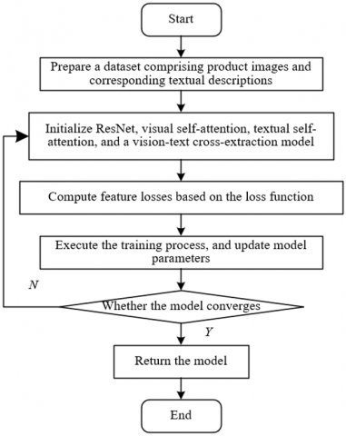 The algorithm training workflow was designed with the core objective of adapting to the unique characteristics of e-commerce data while strengthening cross-modal collaboration. Model performance was improved through a phased optimization process. The initial stage involved data preprocessing tailored to the properties of e-commerce data. For image data, background removal, angle normalization, and illumination enhancement were performed to ensure that visual input remains focused on the product itself. For textual data, non-essential marketing expressions such as “bestseller” or “hot sale” were filtered out. Only core elements—typically consisting of category and attribute terms—were retained. Synonym replacement was applied to enhance dataset diversity. Following preprocessing, the refined dataset entered the iterative training phase. Product images were processed through the visual feature extraction module to generate global features DH and local features DM, which were then fused into the comprehensive visual representation DN. Simultaneously, the textual feature extraction module encoded the textual input into the representation DS. During training, four loss functions operated in coordination to guide the model. The triplet loss ensured that products with the same style and attributes are positioned closer in the shared feature space. The class-supervised cross-entropy loss reinforced the salience of category-specific features. The masked language loss promoted fine-grained image-text alignment through the masked attribute terms. The image-text matching loss enabled the model to filter mismatched image-text pairs. The cross-extraction module indirectly optimized the single-modality modules. Through iterative learning, model parameters converged to an optimal configuration that enabled precise recognition of correlations between product characteristics and user intent in e-commerce settings. Figure 4 illustrates the conceptual architecture of the cross-modal product image retrieval model for e-commerce recommendation, while the complete training workflow is depicted in Figure 5.
