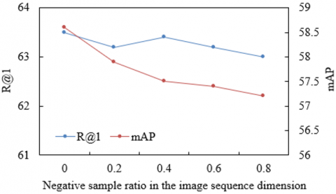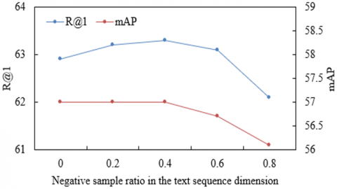 The retrieval robustness of the proposed approach under real-world livestreaming conditions was elucidated by examining the effect of varying negative sample ratios in the WAB dataset along two dimensions: the image sequence and the text sequence. As illustrated in Figure 7(a), when the proportion of mismatched product images increased from 0 to 0.8, Recall@1 declined only marginally from 63.8% to 62.2%, a reduction of merely 1.6 percentage points. Meanwhile, mAP dropped from 61.8% to 61.0%, reflecting a limited decrease of 0.8. This gradual degradation underscores the advantage of the global-local visual feature extraction module in terms of fine-grained local features. Under supervision from product category labels, the module was enabled not only to capture holistic product contours but also to extract category-discriminative local features with high precision, including neckline cut, cuff texture, and shoe curvature. Even when a large number of visually similar product images were introduced into the retrieval pool, these irreplaceable local features continued to support the rapid identification of the target product. However, as the number of negative samples increased, the ranking precision was mildly affected, reflecting a retrieval logic of "first-hit prioritization with progressive re-ranking," which aligns well with the practical requirements of e-commerce recommendation systems.