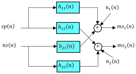 $\begin{gathered}m s_1(n)=s p(n) * h_{11}(n)+n_1(n)+n s(n) * h_{21}(n)\end{gathered}$ (1)