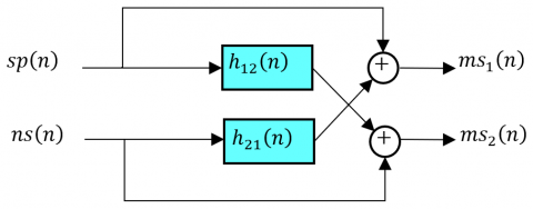 $\begin{aligned} m s_2(n)=n s(n) & * h_{22}(n)+n_2(n)+s p(n) * h_{12}(n)\end{aligned}$ (2)