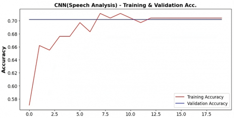 CNN models have been proposed for examining verbal data, yielding a commendable accuracy of 70.4% in Figure 14. As shown in Table 10, the model's performance is further characterized by an F1 score of 0.58, a precision reaching 0.49, and a recall rate of 0.70.