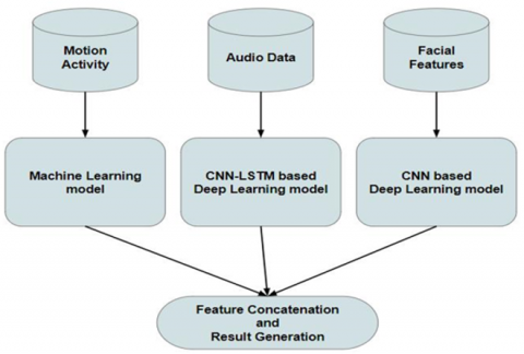 In the pursuit of advancing depression detection using diverse methodologies, the research harnessed the power of diverse machine learning and deep learning models by capturing different indicators, namely facial, verbal, and motion which together provide a better understanding of a person’s mental state, and ensemble approach to integrate the results of all three models and capitalize distinct strength of all models. A CNN model designed to capture facial features exhibited remarkable proficiency with a test accuracy of 99.47%. The CNN model for analyzing verbal data achieved a commendable test accuracy of 70.4%, and to analyze motion activity of a person, Random Forest, K- K-Nearest Neighbor, XGboost, and LSTM model architecture, strategically structured to process complex temporal information, achieved the highest accuracy using the LSTM model of 72%. The research work not only achieved comparable accuracy with the state-of-the-art referenced work in depression detection as shown in Table 1, but also emphasized the potential of collaborative model integration. In the trajectory of the research, several promising avenues emerge for future exploration. One compelling direction involves the deployment of the developed models onto embedded devices, paving the way for real-time inferences. The practical implementation could extend the applicability of depression detection to diverse scenarios, such as wearable devices or edge computing environments despite of having various practical challenges which need to addressed, such as computational resources, and latency requirements, for embedded devices evaluating the models in a real-time setting will not only test their efficiency in dynamic, everyday situations but also provide valuable insights for potential real-world applications.