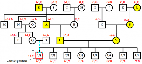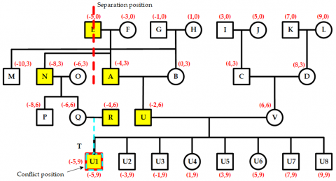When a conflict occurs between adjacent nodes M (outer side) and N (inner side) at layer α, the first step is to check whether their father nodes J and K (or mother) are the same or both are children of an ancestor-type node. If not, J and K are repeatedly updated to their respective fathers (or mothers). This process continues until J and K share the same parent U or both are children of an ancestor-type node. The layer containing J and K is called the separation layer, while the layer with M and N is called the conflict layer. In the left-wing region, the conflict separation point is defined as the midpoint between the node J (or its spouse, if any) and node K. In the right-wing region, it is the midpoint between the node K (or its spouse, if any) and node J.