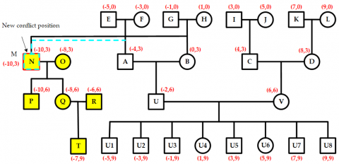 The nodes N and O, along with their descendant nodes P, Q, R, and T, form the conflict area. To resolve this, the entire conflict area shifts two units to the left, as shown in Figure 15. This movement causes a new conflict between nodes M and N, with a conflict value of two units. Because M and N are children of an ancestor-type node, their layer is again marked as the separation layer. At this point, only node M contains a new conflict area. To fix this, node M is shifted leftward by two units, completing the secondary conflict adjustment, as shown in Figure 16. Consequently, all conflicts in the pedigree are eliminated, and the pre-allocated positions for all nodes are finalized.