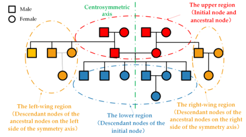 A pedigree layout is usually arranged symmetrically around the perpendicular bisector of the initial nodes. Depending on where the nodes are placed, the pedigree is divided into four parts: the upper, lower, left-wing, and right-wing regions (see Figure 1). The upper region includes the initial nodes and their ancestors; the lower region contains all their descendants; and the left-wing and right-wing regions represent the descendants of those ancestor nodes.