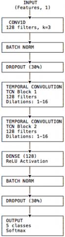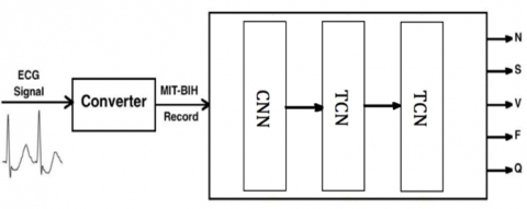 A schematic of the proposed artificial intelligence classifier is illustrated in Figure 4. To ensure compatibility with the CNN-TCN classifier [47-49], an ECG signal indicating a potential cardiac anomaly must be converted into the format of the MIT-BIH Arrhythmia Database before cloud transmission. This conversion aligns the real-time data from the AD8232 module with the classifier's foundational training dataset. This conversion was motivated by the fact that the MIT-BIH dataset remains the benchmark reference for arrhythmia detection studies, and aligning our input data with its specifications allows both interoperability and meaningful comparison with existing literature. There were multiple sequential steps in the process. To reduce noise while preserving clinically meaningful information, digital bandpass filtering in the 0.5-40 Hz range was used to condition the raw ECG signals, which inherently contain baseline wander, muscular artifacts, and powerline interference. Baseline drift was corrected using polynomial detrending or high-pass filtering, and amplitude normalization was applied to match the 10 mV range and 11-bit resolution characteristic of MIT-BIH recordings. Since the AD8232 module does not natively sample at 360 Hz, which is the standard sampling frequency of MIT-BIH signals, the ECG traces were resampled by interpolation to precisely align with this reference rate. Once preconditioning was complete, the continuous signals were segmented into heartbeat-centered windows. This segmentation relied on R-peak detection, typically via a threshold-based or Pan-Tompkins method, followed by extraction of fixed-length intervals of 187-188 samples around each peak, replicating the structure used in the MIT-BIH CSV version. Each segment was then annotated with a heartbeat label (Normal, Supraventricular, Ventricular, Fusion, or Unknown) based on its morphological and temporal features. Finally, the preprocessed data was saved in the canonical MIT-BIH file structure consisting of three complementary files: a .dat file containing the ECG waveform, a .hea header file storing metadata such as patient ID, duration, and sampling rate, and an .atr file recording annotations and beat locations. In addition to making our deep learning experiments reproducible and allowing for equitable benchmarking against earlier work in ECG-based arrhythmia detection, this structured pipeline guarantees that the real-time signals are rendered fully interoperable with PhysioNet-compatible tools. The MIT-BIH Arrhythmia Database is a widely recognized benchmark in the field, forming the basis for numerous research initiatives, including the development of arrhythmia detection algorithms and the evaluation of diagnostic methodologies across a broad range of studies [50-54].