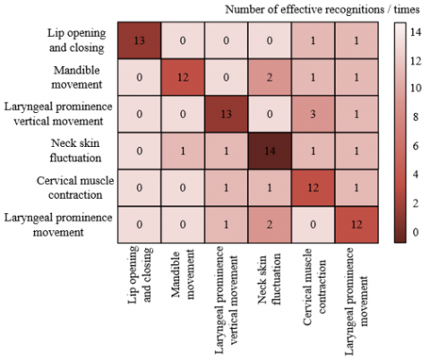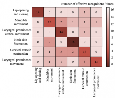 Combined with the confusion matrix comparison in Figure 6, the swallowing motion recognition results before and after feature enhancement show significant differences. As shown in Figure 6(a), before feature enhancement, there are considerable confusions among certain categories: for example, the cumulative misclassifications among jaw movement, laryngeal elevation and depression, neck skin undulation, and laryngeal movement reached 8 times; misclassifications between jaw movement, laryngeal elevation and depression, and neck muscle contraction were 5 times. After feature enhancement, these confusions were significantly improved: misclassifications of neck muscle contraction were reduced to 2 times; errors in laryngeal movement decreased by 3 times. Meanwhile, although the correctly recognized counts for categories such as lip opening/closing, jaw movement, and laryngeal elevation and depression fluctuated slightly, the overall off-diagonal error values substantially decreased, indicating that the multi-scale detail enhancement technique effectively improved the distinguishability of features. The enhanced method significantly improved recognition accuracy for complex swallowing motions and reduced error rates, demonstrating the effectiveness of this technique in swallowing motion feature extraction and recognition.