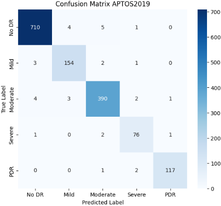 For clearer understanding, refer to the retinal fundus images that represent various phases of DR. Figure 2 displays example images corresponding to the five graded severity levels of DR. Below Table 1. gives the image distribution between 3 benchmark datasets. The decision to use data augmentation led to 60:40 as the training and test split and total number of images was raised to 143,669 and data augmentation was performed exclusively on the training set, with care taken to avoid any overlap with the test samples.