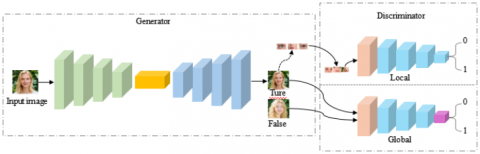 The computational time of the discriminant module accounts for a large proportion of the total operation time of the model, so it is necessary to optimize it to improve the overall running speed of the model [21]. We propose a dual-discriminator architecture, which includes the design of a global discriminator and a local discriminator. The global discriminator strengthens the texture and structural information of the entire image, while the local discriminator enhances key facial information such as eyes, nose, and mouth. Through their synergistic effect, the ability to distinguish the authenticity of generated images is significantly improved.