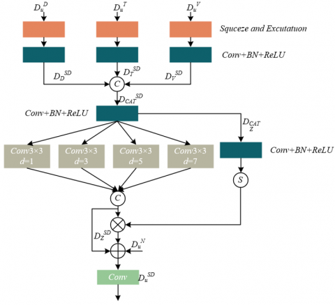 The core goal of the tri-modal feature fusion module for educational management is to construct more robust learning behavior representations by complementary enhancement of appearance behavior information from RGB images (such as students raising hands or writing posture), spatial relationship information from depth images (such as relative distance between students and podium/peers), and physiological engagement information from thermal infrared images (such as attention concentration implied by facial temperature changes). The module architecture is shown in Figure 2. The module first performs input calibration on the same-level features {DFu, DNu, DSu} extracted by three parallel encoders. Specifically, each modality feature is independently input into a sequence consisting of a Squeeze-and-Excitation block and a Convolution–Batch Normalization–ReLU block. The SE block generates channel weights through global average pooling and fully connected layers to achieve dynamic calibration. For example, in analyzing a group discussion scene, the weight of the depth modality may be increased; while in recognizing individual reading behavior, the importance of the RGB modality may be enhanced. The calibrated features {DSDN, DSDF, DSDS}are concatenated along the channel dimension to form the preliminary fused feature DSDCAT, laying the foundation for subsequent deep mixing. Specifically, the operation of the SE module is denoted as dTR(·), the convolution layer as ZYE(·), and the concatenation operation as [ , , ], then: