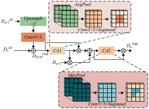 This module first upsamples the higher-level semantic features DSDu+1 with lower resolution by bilinear interpolation and uses a convolution layer to adjust its channel dimension so that it is consistent in size with the current level feature DSDu. After adding the two, the initial aggregated feature DVMRSUM is obtained, which preliminarily fuses behavioral semantics from deep layers and spatial details from shallow layers. This process can be expressed as: