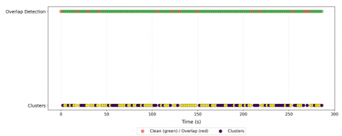 (b) The result of the diarization. The red dots in the top line refer to segments detected as speech overlaps; they were not submitted to the clustering algorithm.