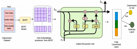 Figure 6 depicts the proposed hybrid architecture incorporating BERT and GRU is designed to utilize both textual and auditory data for the purpose of classification. The input text sequences are tokenized and fed into a pre-trained BERT model. BERT generates a sequence of rich, contextual embeddings for each token, capturing deep semantic information relevant to mental state analysis as elaborated in section 3.4. The sequence of embeddings from BERT serves as input to a Gated Recurrent Unit (GRU) layer. The GRU is adept at learning long-range dependencies within sequential data, allowing the model to understand the progression and context of the subject's speech over time as discussed in section 3.2. The final hidden state of the GRU, which encapsulates the sequential information of the entire input sequence, is passed through a fully connected (dense) layer with a softmax activation function to produce a binary classification (depressed or non-depressed).