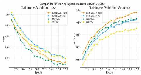 The proposed models—BERT coupled with CNN, GRU, and BiLSTM classifiers—were trained end-to-end over 50 epochs. The optimization was performed using Adam with weight decay (AdamW), which is specifically advantageous for fine-tuning pre-trained BERT parameters as it helps prevent overfitting and promotes convergence to a better optimum. A learning rate of 1 × 10⁻³ was initially explored, but based on grid search within the commonly recommended range (1e-5 to 5e-5), 3 × 10⁻⁵ was found to provide more stable convergence and superior performance shown in Table 1. A batch size of 64 was adopted to ensure efficient utilization of GPU memory while maintaining training stability. Softmax was employed as the activation function to enable probabilistic classification, and sparse_categorical_crossentropy loss function was utilized to measure the discrepancy between predicted and true class labels. These parameter settings were validated through sensitivity analysis and training–validation loss curves, which confirmed smooth convergence and reliable generalization.