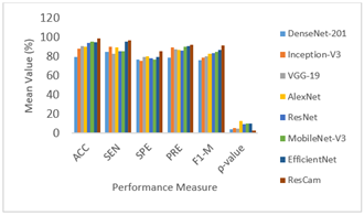 By introducing a dropout mechanism and a dense layer with an appropriate activation function, EfficientNet provides better results regarding evaluation measures. It achieves accuracy, sensitivity, specificity, precision, F1-Measure, and ρ-value with 95.03%, 95.50%, 79.47%, 91.23%, 86.80%, and 9.81%, respectively. From the empirical results, it is clear that the ResCAM realizes 98.90% accuracy, 97.1% sensitivity, 85.80% specificity, 92.70% precision, and 93.60% F1-measure. Besides, it achieves a reduced ρ-value (i.e., 0.5%) which designates that the results of ResCAM are significant.