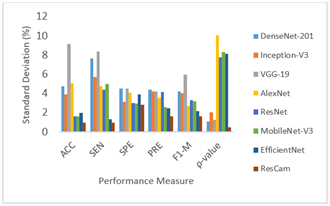 ResCAM produces the lowest SD values in the classification task with 1.0% accuracy, 0.9% sensitivity, 2.8% specificity, 1.6% precision, 1.7% F1-measure, and 0.5% ρ-value. The SD value of performance measures gained from the APTOS-2019 database by each DR classification network is listed in Table 10. From Figure 11, it is clear that the SD of the ResCAM is less than other retinopathy detection models. Hence, the ResCAM generates much more reliable results for classifying DR as compared with the other models. Therefore, ResCAM is considered a very feasible model for classifying diabetic retinal disease in the medical industry.