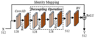To handle the vanishing gradient problem of the system, we intend to develop a typical residual structure [26]. In this research, we propose a 3D residual network that is suitable for high-level feature selection. Figure 4 shows the structure of the 3D residual unit. It receives the low-level features extracted by the LFE unit and then sends them to the convolutional and standardization units to excerpt the abstract and higher-level features. Through residual modules, input images can be sent faster over shortcut connections across layers. The residual unit is deemed as an exceptional case of the multi-branch Inception unit. This model comprises two residual structures. Each structure comprises 4 convolutional layers, 4 normalization layers, and a summation layer. The convolution layer is followed by a Batch Normalization (BN) layer and a ReLU. Then, skip 2 convolution layers using the decoupling process and add the input to the final ReLU module. This form of architecture makes the output of the two convolutional layers need to be of equal dimension as the input; therefore, they can be added together. If the number of channels, it is required to include an additional 1×1 convolutional layer to convert the input into the desired dimension for the addition operation.