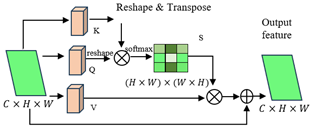 where, $A$ is the attention score matrix, $\circ$ denotes the dot product between the query and key, $\sqrt{C}$ is a scaling factor to evade large values that could deter the softmax operation. To ensure that the attention weights are between 0 and 1 and sum to 1, we apply the softmax operation over the attention scores as given in Eq. (9):