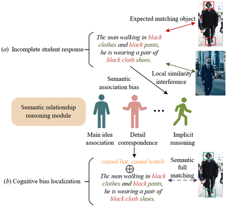 Finally, the system generates a dynamic, personalized ability assessment report by integrating multimodal matching signals with the cognitive diagnostic model. This report not only contains the student’s proficiency probabilities across various ability dimensions but also provides interpretable cognitive diagnostic evidence. For example, the system might clearly indicate: "The student encountered difficulties with spatial relationship reasoning. Their answer failed to establish an effective link between the text description 'behind the tree' and the corresponding area in the image," and automatically recommend practice materials for "understanding spatial prepositions" and "analyzing complex scenes." This entire mechanism transforms advanced computer vision and natural language processing techniques into deep educational insights, realizing a shift from "grading answers" to "diagnosing thought processes." Figure 4 illustrates a typical cognitive bias in students' image-text relationship understanding and the diagnostic correction mechanism.