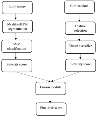 where, Severityscore(s, c) represents the final severity score for samples in severity class c. pmc (s) denotes the probability or label for samples in severity class c obtained from the image and data mining classifications. By appropriately assigning weighting coefficients to each modality, the fusion module ensures a robust and comprehensive severity classification, enhancing the accuracy of patient assessments.