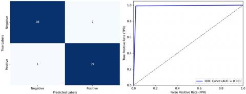 The visualization of the feature importance plot for the ENN classifier is shown in Figure 8. It highlights that Age and Cholesterol rate are the most influential factors and Sex has the least impact. The visualisation of the confusion matrix and the ROC plot of the proposed ENN models is shown in Figure 9. The confusion matrix for the proposed method reveals remarkable diagnostic accuracy. It correctly identifies 98 cases of the medical condition (True Positives) and accurately recognises 99 instances without the condition (True Negatives). With only 2 False Positives, it exhibits high precision, avoiding unnecessary alarms. Additionally, the method minimizes missed diagnoses, with just 1 False Negatives, highlighting its excellent sensitivity. In summary, the proposed method excels in both precision and sensitivity, making it a highly promising approach for medical image classification and disease diagnosis.