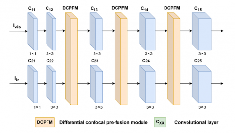 The encoder is the front-end part of the main network and is responsible for feature encoding of the input infrared and visible images. This part uses standard convolutional blocks to extract semantic features of the two modality images separately. On this basis, to enhance feature complementarity and reduce redundancy, this chapter proposes a DCPFM, which uses an interactive feature extraction mechanism to connect features of the two different modality source images during the feature extraction stage, providing a feature basis for efficient fusion of infrared and visible information in the fusion layer.