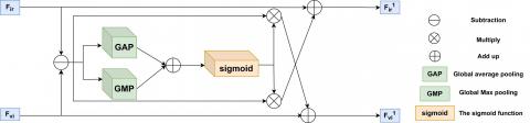The DCPFM first calculates the difference between the input infrared feature map and visible feature map to obtain the differential features. Then, the differential features are subjected to Global Average Pooling (GAP) and Global Max Pooling (GMP). GAP is used to capture global statistical information of the differential features, while GMP is used to extract salient information from the differential features. The two pooled feature maps are added pixel-wise, and the differential feature vector is mapped to the range (0,1) through the Sigmoid activation function, generating attention weight vectors for the infrared and visible feature maps, respectively. Next, the generated infrared and visible attention weight vectors are multiplied with the differential features separately. Finally, the weighted feature maps are added to the differential features to obtain pre-fused infrared and visible features containing different modality information, which are input to the next convolutional layer for further processing. In the pre-fusion module, GAP and GMP are simultaneously used to obtain global statistical information. GAP can better capture global information, while GMP can emphasize salient features. Combining these two pooling methods can fully utilize their respective advantages, reduce the dimensionality of the differences between infrared and visible features, and obtain more comprehensive and robust feature representations.