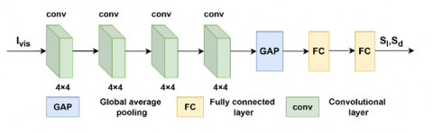 In the illumination prior regression network, the input visible image Ivis first passes through four 4 × 4 convolutional layers, expanding the channel dimension to 128 with LeakyReLU activation. The convolution output is then globally average pooled and input into two fully connected layers to obtain two non-negative scalars Sl and Sd. Sl and Sd represent the brightness and darkness degree of the input image, respectively.